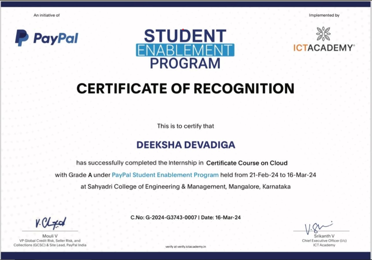 Pursued an internship training by PayPal on AWS Certified Cloud Practitioner (CLF-C01), focusing on cloud and AWS services, trained by ICTACADEMY. Traning durtion : 1 month.