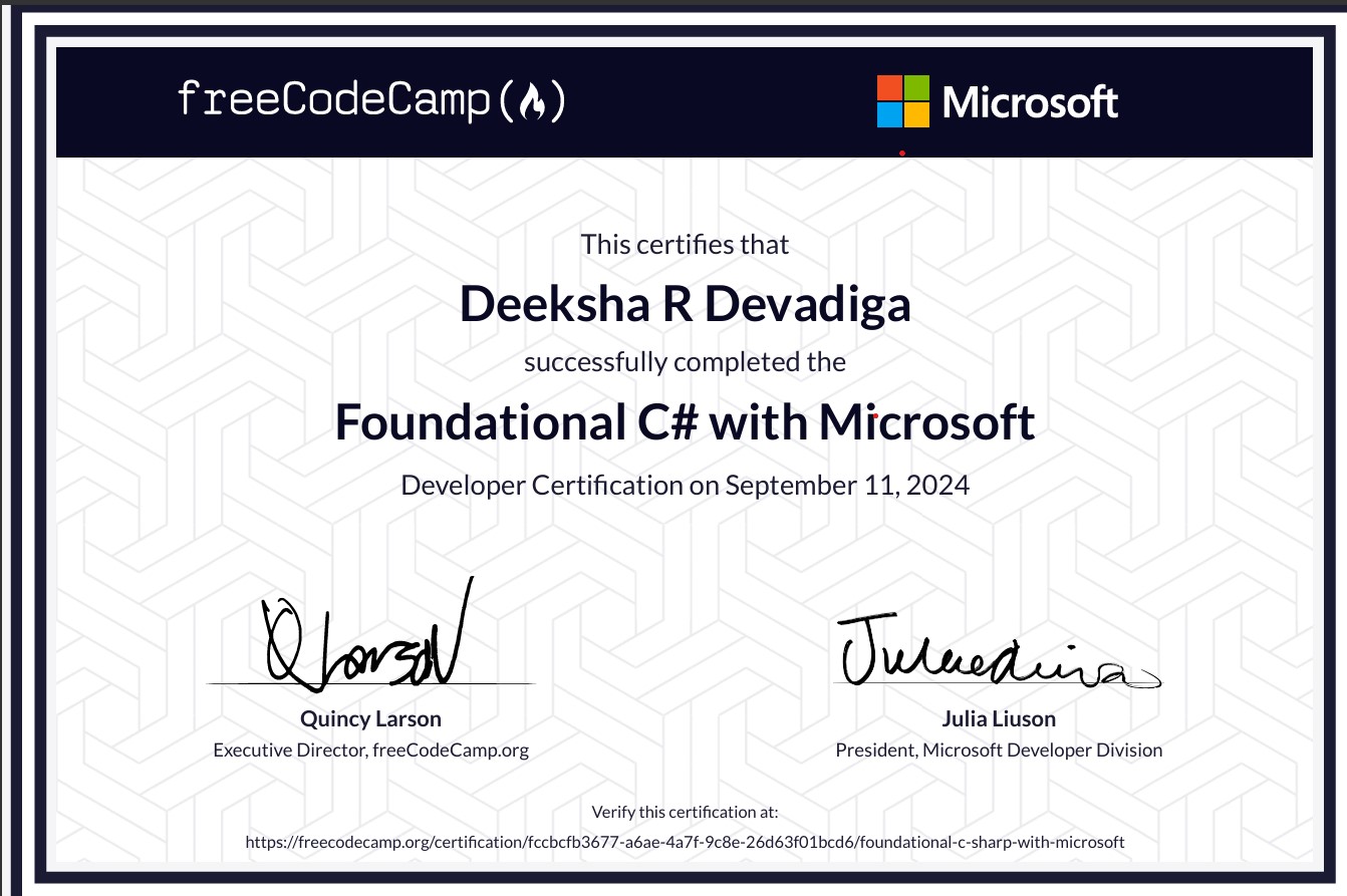 Successfully completed the Foundational C# with Microsoft Developer Certification on September 11, 2024, through freeCodeCamp & Microsoft.