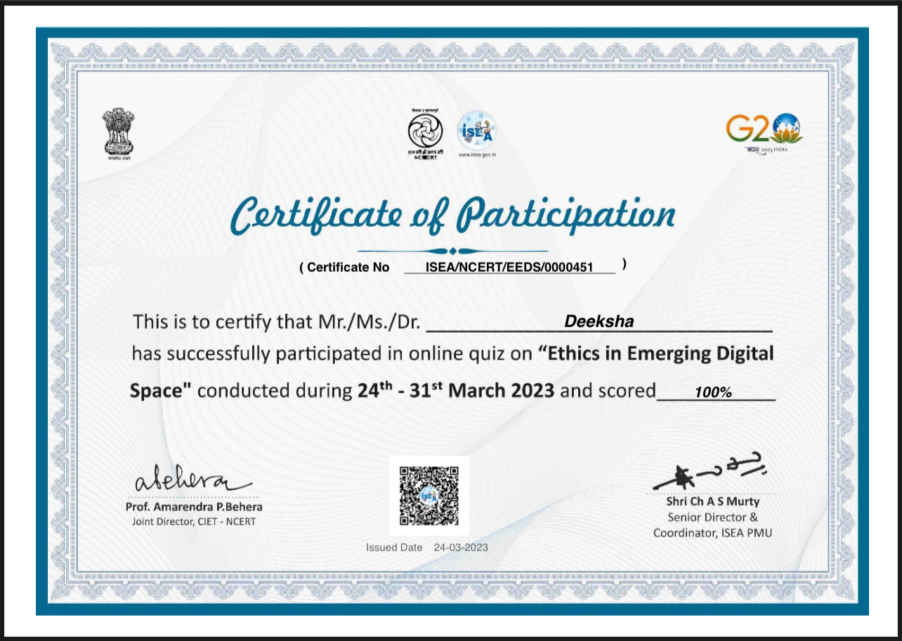 March 24, 2023: Scored 100% in the Ethics in Emerging Digital Space quiz, showcasing my knowledge in digital ethics.